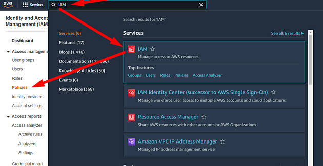 Busque IAM en servicios, haga clic en IAM — administre el acceso a los recursos de AWS, luego, en el menú lateral, seleccione Políticas
